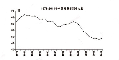 消费、投资、出口是核心经济增长的三驾马车, 其中消费又是最主要的马车,是GDP增长的主要因素,从国民经济统计的角度看,最终消费包含两部分,一区分是居民消费,另一部分是政府消费,有学者对1999-2008年我国31个省(市、自治区)的相关数据进行了分析,实证表明,从全国范围来看,无论是城镇、农村居民消费还是政府消费对经济增长的影响都是显著的,但三者对经济增长的拉动程度不同,城镇、农村居民消费和政府消费每增长1个单位,分别可以促进经济增长0.59、0.49和0.23个单位。从我国居民消费占GDP的比重来看,近十年来不升反降,仅为35%,而世界其他主要经济体中,这个数字都大于50%,欧洲是58%,日本是55%,美国高达72%,而自1978年以来,我国政府消费在最终消费中的占比几乎每隔10年就要上一个台阶:80年代大约稳定在21%-23%;90年代上升并稳定在24%-25%;2000-2010年进一步提高到26%-27%;2011年已爬上28%,在1978-2011年的34年中,有22年政府消费的增速高于居民消费。