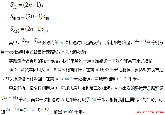 相遇问题中还有一类让大多数考生十分头疼的问题——多次相遇问题。大家往往会搞混整个过程中各人之间的路程、时间关系。这里可以告诉大家,多次相遇问题有一条捷径,就是一句“至理名言”,即:“两人的多次相遇问题中,第n次相遇时,两人所走路程总和是两地间距s的(2n-1)倍,每个人各自所走的总路程是自己在第一次相遇时所走路程的(2n-1)倍。”可以概括为以下公式: