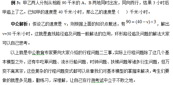假设两人是甲和乙,甲速度高于乙速度,甲乙间距为s,甲在途中追上乙,那么实质上就是甲比乙多走了s这一段路程。如果两人同时出发,就有s=(甲速度—乙速度) 追及时间=速度差 追及时间,这就是追及问题(直线路径)的一般解决方法。我们还是来看一道例题: